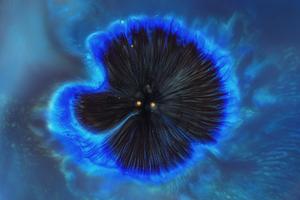 This abstract photograph immerses the viewer in the dark, boundless expanses of space. The image is created using a unique technique that combines acrylic paints, water, and other liquids, exploring the interaction of color, texture, and fluid dynamics. Deep shades of blue and black dominate the scene, creating an atmosphere of mystical, endless space. Bright golden glitter, like bursts of stars, is scattered across the image, giving it a sparkling energy. Blue and turquoise boundaries, like cosmic currents, wrap around the central form, guiding the viewer’s gaze toward its core, creating a sense of movement and infinity. This visual exploration examines the balance between chaos and order on a galactic scale, where brilliant flashes of light emerge from deep darkness, symbolizing the endless cycle of creation and destruction in the universe.